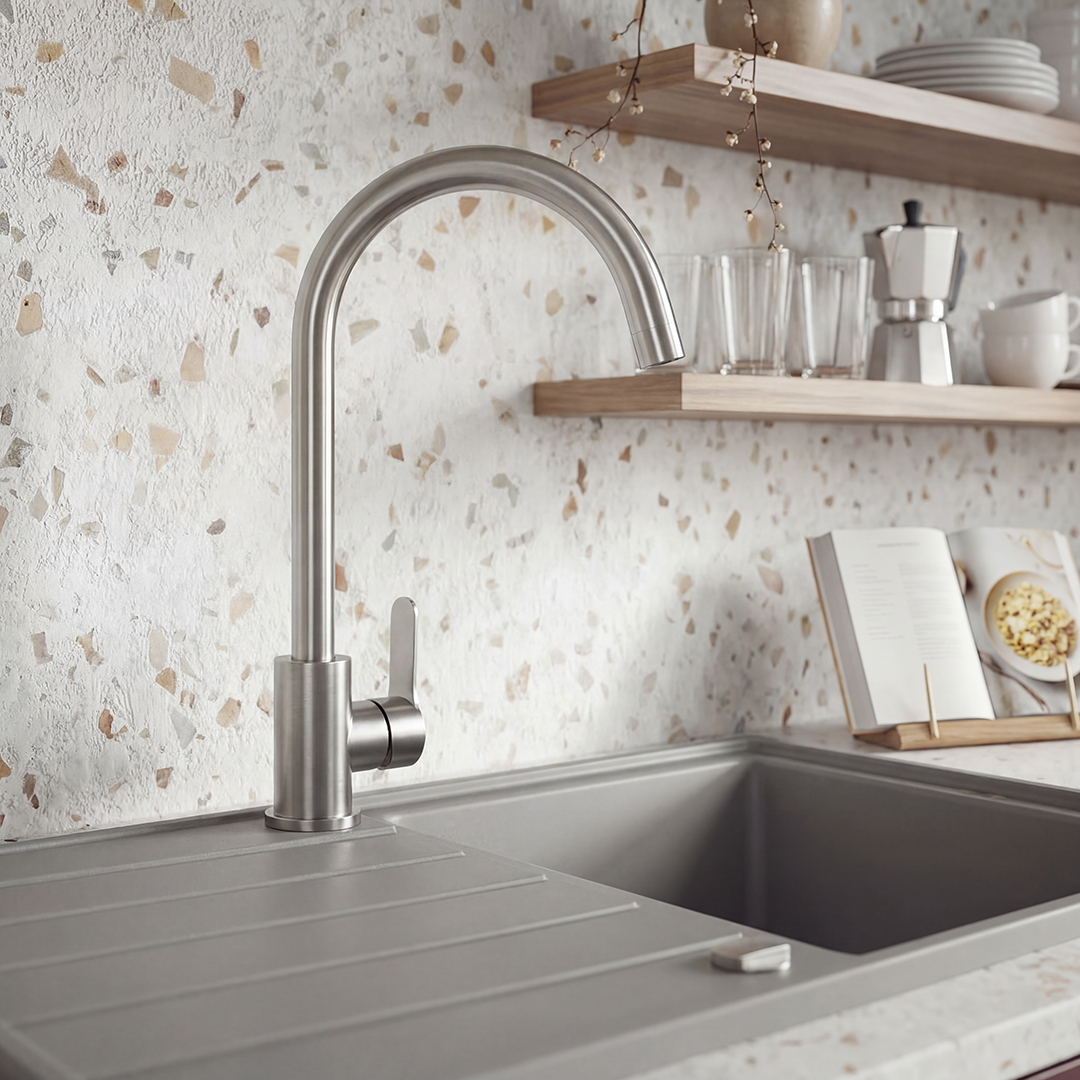 To kolorystyka, która nie dominuje aranżacji, lecz subtelnie ją porządkuje. Dzięki temu bateria Mono może stać się spójnym elementem nowoczesnej kuchni, niezależnie od tego, czy wnętrze ma charakter surowy, ciepły, czy bardziej klasyczny.