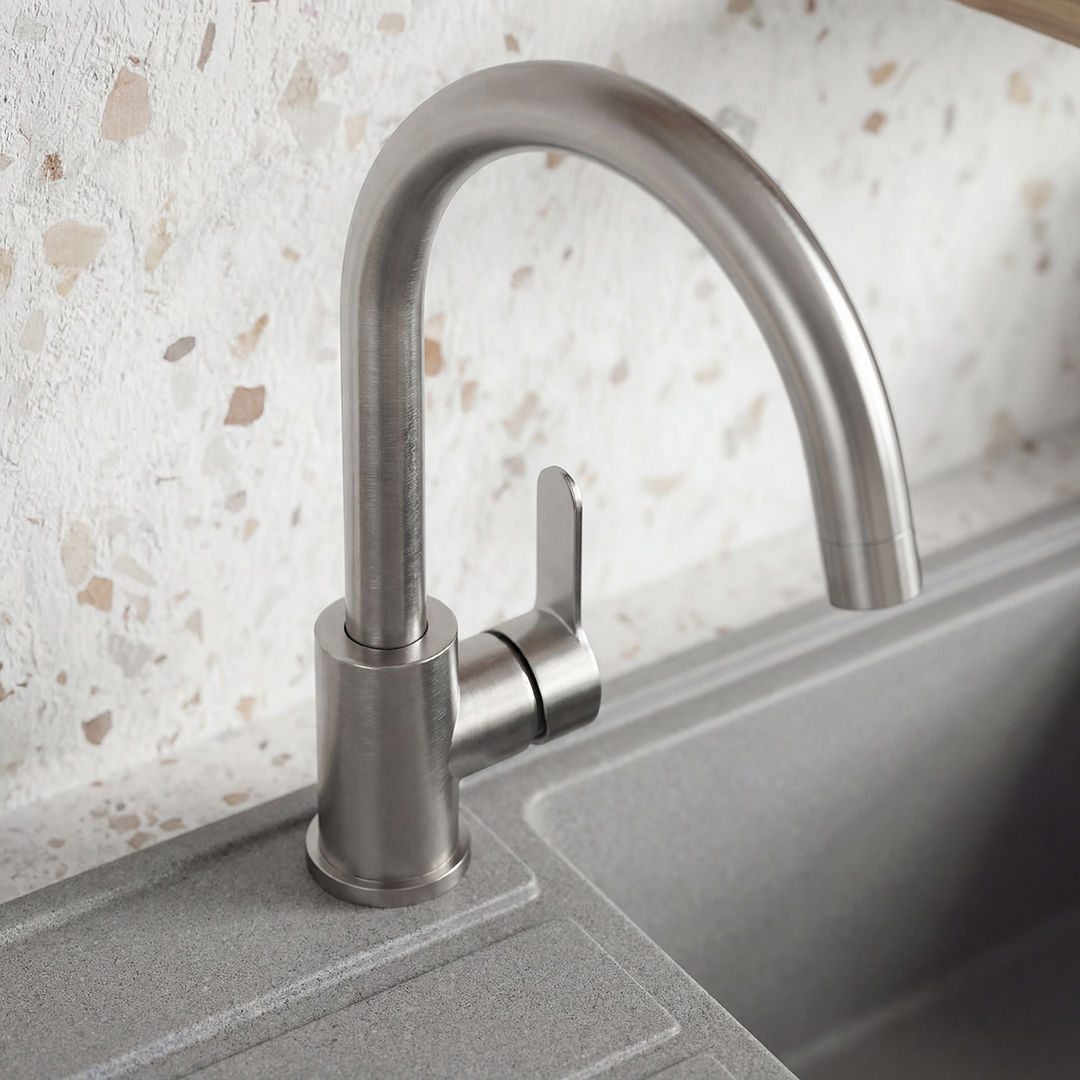 Bateria zlewozmywakowa Mono w wykończeniu stali szczotkowanej to propozycja dla kuchni, w której liczy się czysta forma, codzienna wygoda i trwałość oparta na sprawdzonych rozwiązaniach. Jej spokojne wykończenie nadaje wnętrzu nowoczesny, uporządkowany charakter, a klasyczna wylewka U buduje estetykę lekką, harmonijną i ponadczasową.