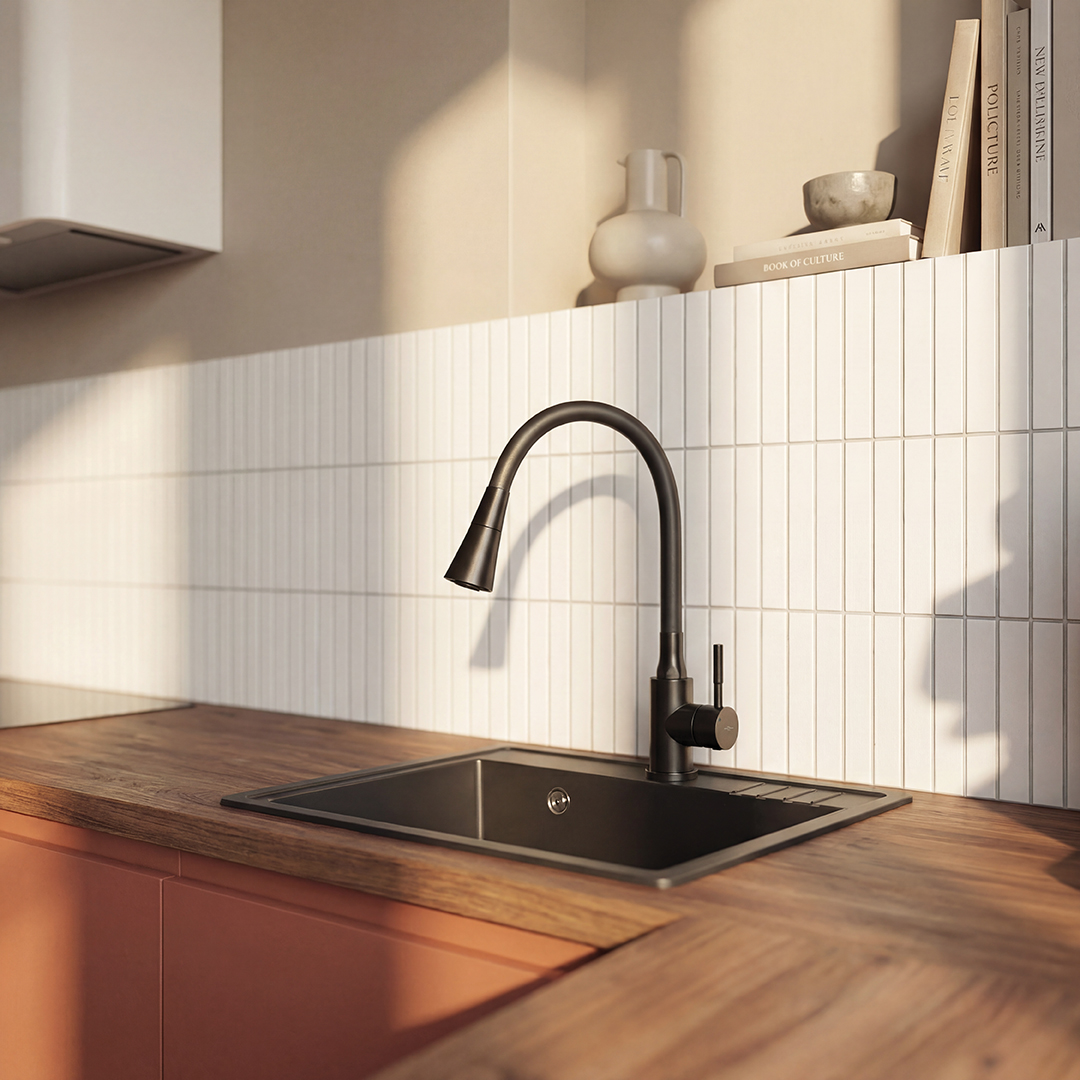 Grafitowe wykończenie świetnie komponuje się ze zlewozmywakami granitowymi w odcieniach szarości, czerni, antracytu i betonu, tworząc spójną i elegancką strefę zmywania. Model dobrze prezentuje się również w połączeniu ze zlewami stalowymi, dodając kuchni nowoczesnego, dopracowanego charakteru. To bateria, która staje się nie tylko praktycznym elementem wyposażenia, ale także ważnym detalem aranżacji.