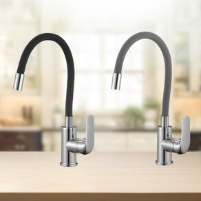 To bateria jakiej nie było w marce Kuchinox. Swój wyjątkowy charakter zawdzięcza ruchomej, wyginanej, gumowej wylewce. Ta elastyczna końcówka ułatwi prace kuchenne a także umycie samego zlewozmywaka.